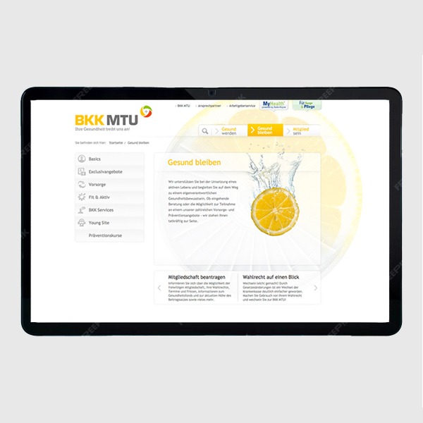 Die BKK MTU Friedrichshafen mit über 16’500 Mitgliedern ist Träger der gesetzlichen Krankenversicherung in Deutschland (Gruppe betriebsbezogene Krankenkassen). Ihren Ursprung hat die Kasse im Unternehmen MTU Friedrichshafen. Mit dem Relaunch ihrer Website im Jahr 2011 konnten wir der BKK MTU dabei helfen, die Fülle an Informationen zum umfangreichen Leistungsportfolio in eine schlanke Form zu bringen. Die textliche Zusammenführung von Wort und Bild mithilfe einer technikaffinen Ansprache versinnbildlicht die Werte des Unternehmens: Antrieb, Dynamik und Fortschrittlichkeit, aber auch die Nähe zu den Bedürfnissen ihrer Mitglieder – kurzum: „Ihre Gesundheit treibt uns an“.