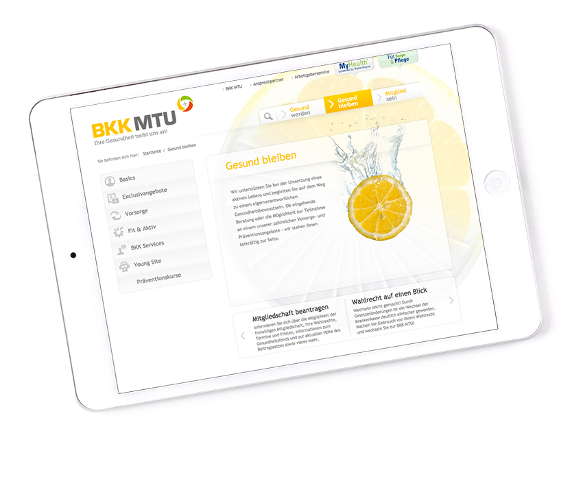 Die BKK MTU Friedrichshafen mit über 16.500 Mitgliedern ist Träger der gesetzlichen Krankenversicherung in Deutschland (Gruppe betriebsbezogene Krankenkassen). Ihren Ursprung hat die Kasse im Unternehmen MTU Friedrichshafen. Mit dem Relaunch ihrer Website im Jahr 2011 konnten wir der BKK MTU dabei helfen, die Fülle an Informationen zum umfangreichen Leistungsportfolio in eine schlanke Form zu bringen. Die textliche Zusammenführung von Wort und Bild mithilfe einer technikaffinen Ansprache versinnbildlicht die Werte des Unternehmens: Antrieb, Dynamik und Fortschrittlichkeit, aber auch die Nähe zu den Bedürfnissen ihrer Mitglieder – kurzum: „Ihre Gesundheit treibt uns an“.