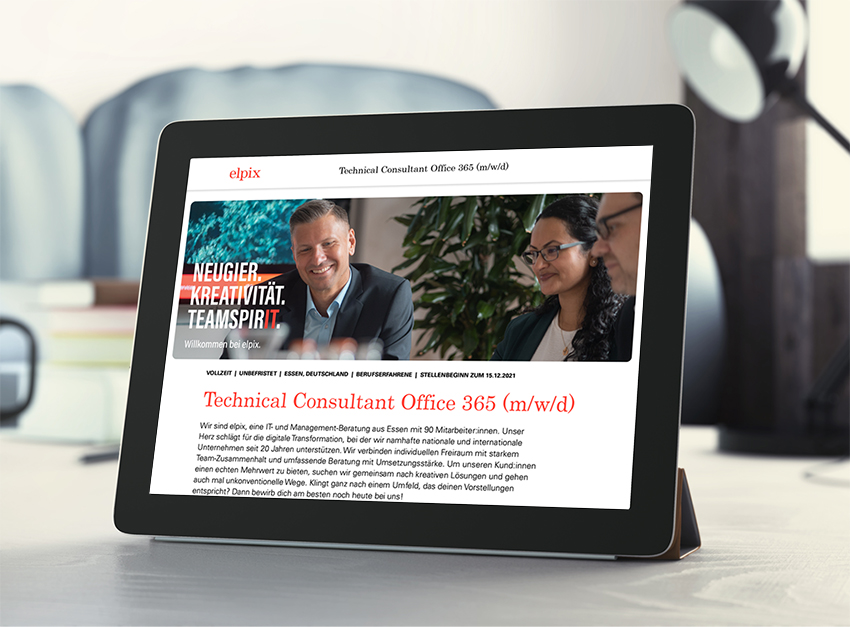 Die elpix AG ist eine IT- und Management-Beratung aus Essen, die seit 20 Jahren namhafte nationale und internationale Kundinnen und Kunden betreut. Als Arbeitgeber verbindet elpix individuellen Freiraum mit starkem Team-Zusammenhalt und zeichnet sich vor allem durch Offenheit für neue Wege und eine Extraportion Gestaltungsspielraum aus. Genau diesen besonderen Spirit transportiert der neue Anzeigenauftritt des erfolgreichen Mittelständlers, für den wir Bildmaterialien mit echten Mitarbeitenden genutzt haben.